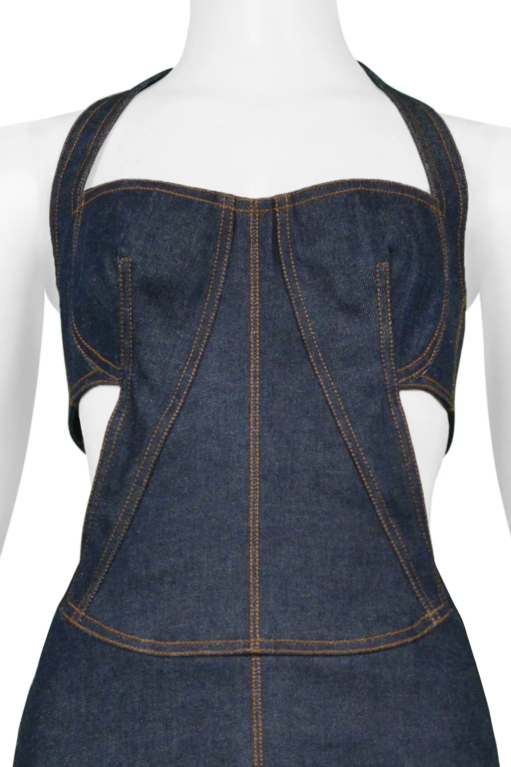 Resurrection Vintage is excited to offer a vintage Azzedine Alaia Edition 1986 reissue blue denim dress featuring a , cutout back, halter style neck, brown top stitching, and mini dress length.Â
