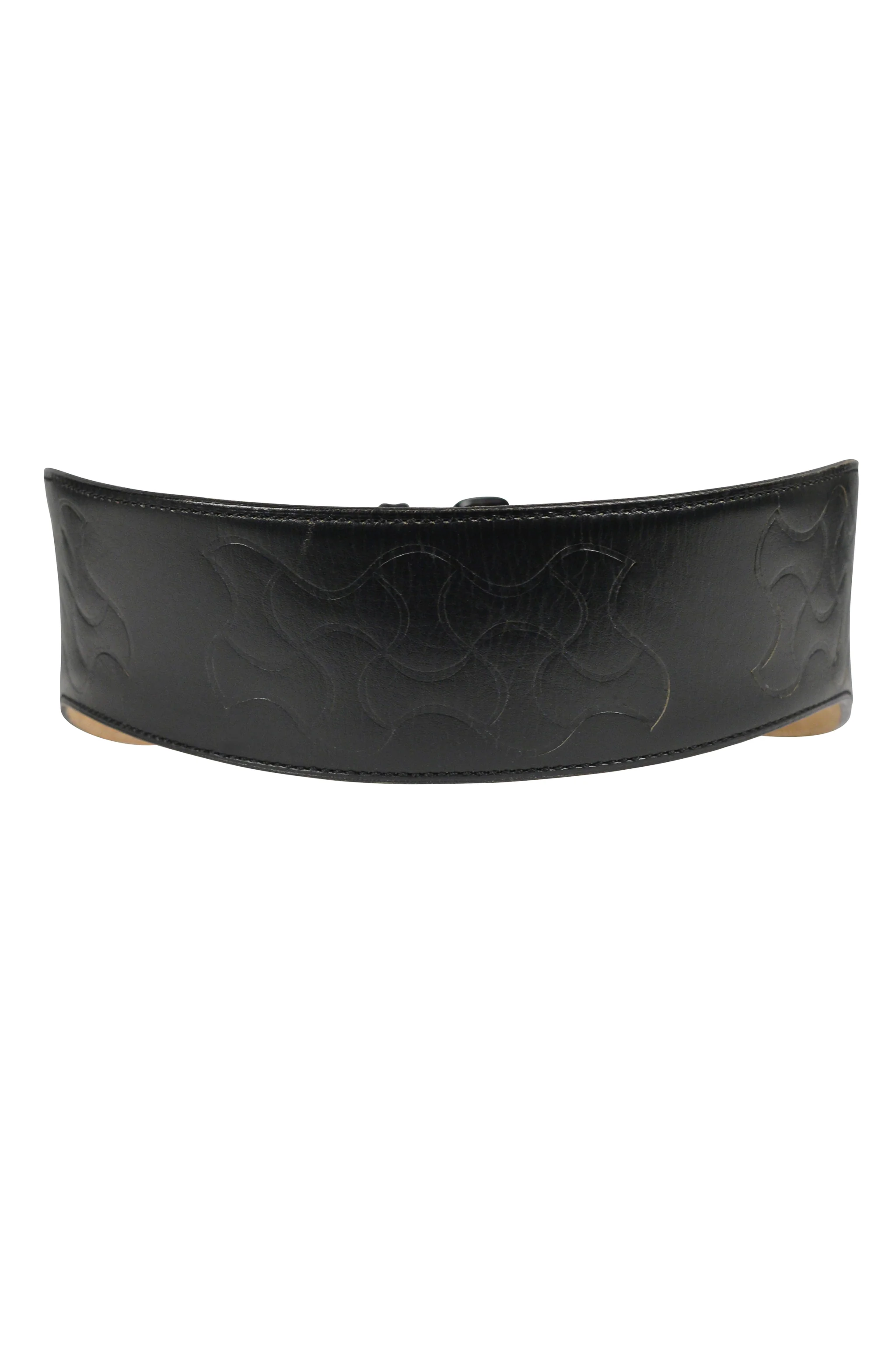 Resurrection Vintage is excited to offer a vintage black leather Azzedine Alaia wide waist belt featuring embossed detailing, a leather covered buckle, and dramatic curved shape. The belt has additional holes to adjust the size.Â