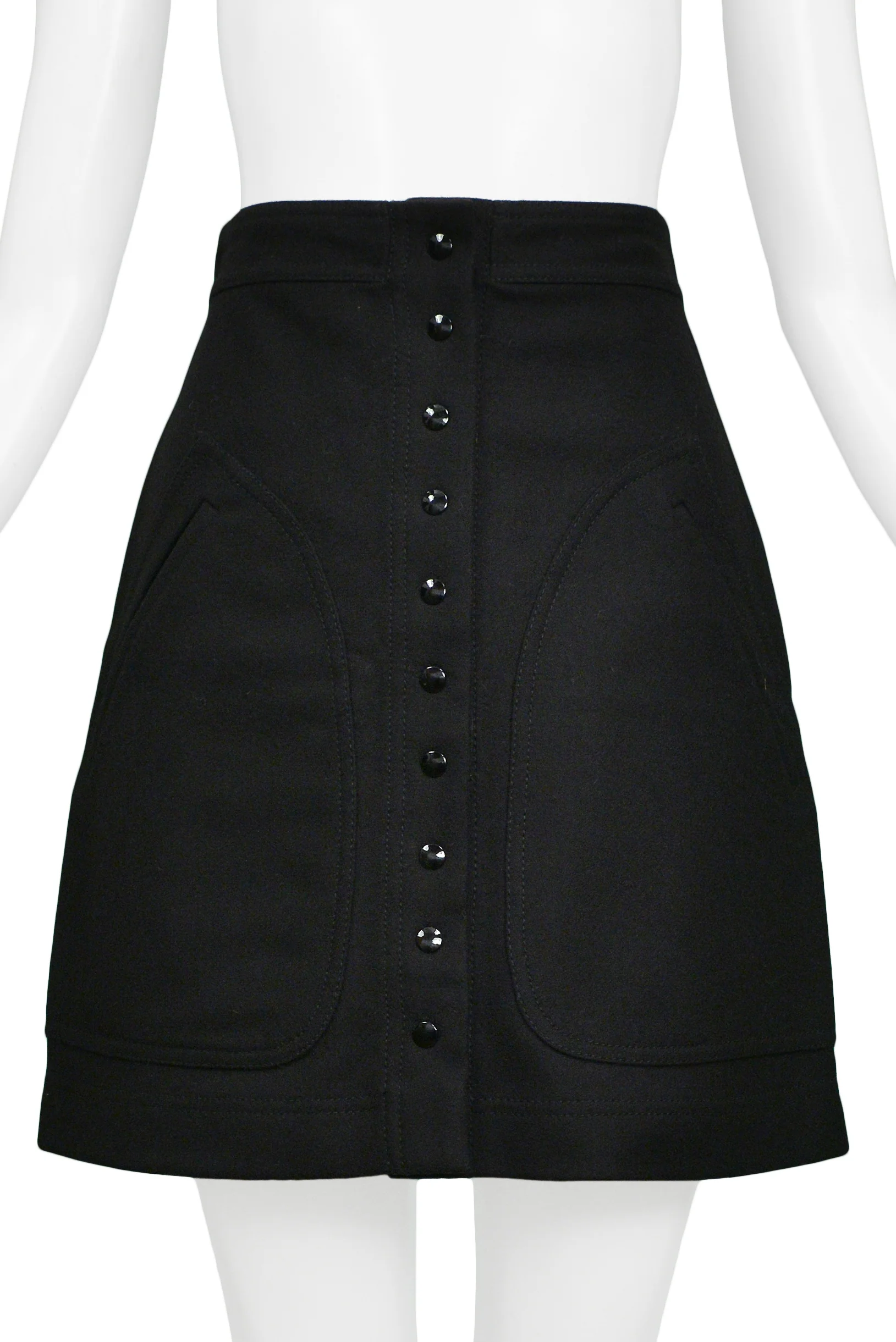 Resurrection Vintage is excited to offer a vintage Nicolas Ghesquière black a-line skirt featuring a high structured waistband, black snaps down the center front of the skirt, and large side pockets with decorative stitching.