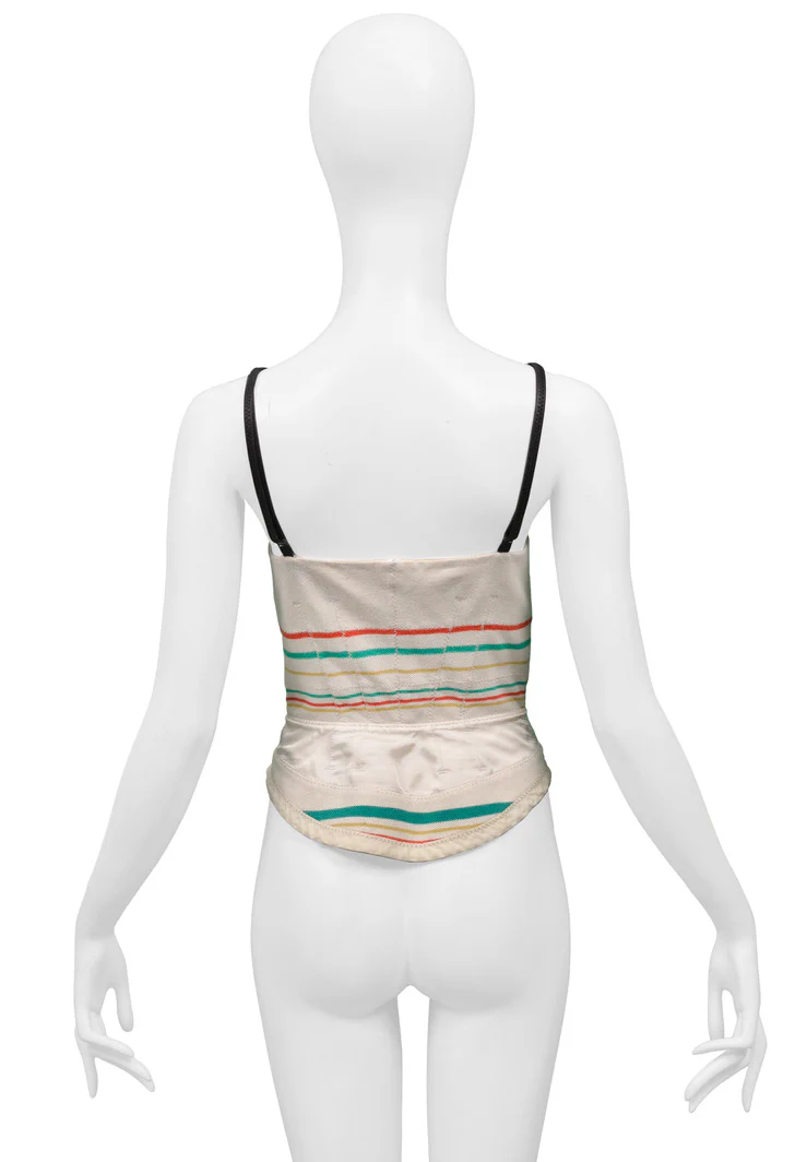 Resurrection Vintage is excited to offer the iconic and highly coveted off-white woven fencing bustier from Balenciaga by Nicolas Ghesquiere featuring green, gold, and red stripes, black straps, two front button panels, and exposed stitching. This piece is in excellent vintage condition with a few minor and faint marks on the interior lining, and a slight mark on the body.