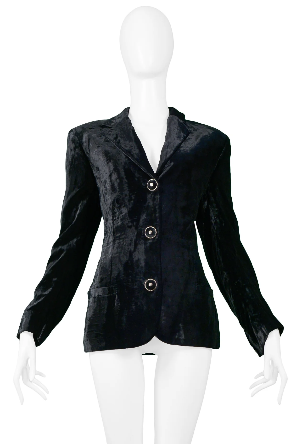 Resurrection Vintage is excited to present a Gianni Versace black velvet jacket and skirt ensemble featuring a black velvet blazer with large black and silver-tone buttons and a matching sleeveless black velvet shift knee-length dress.Â