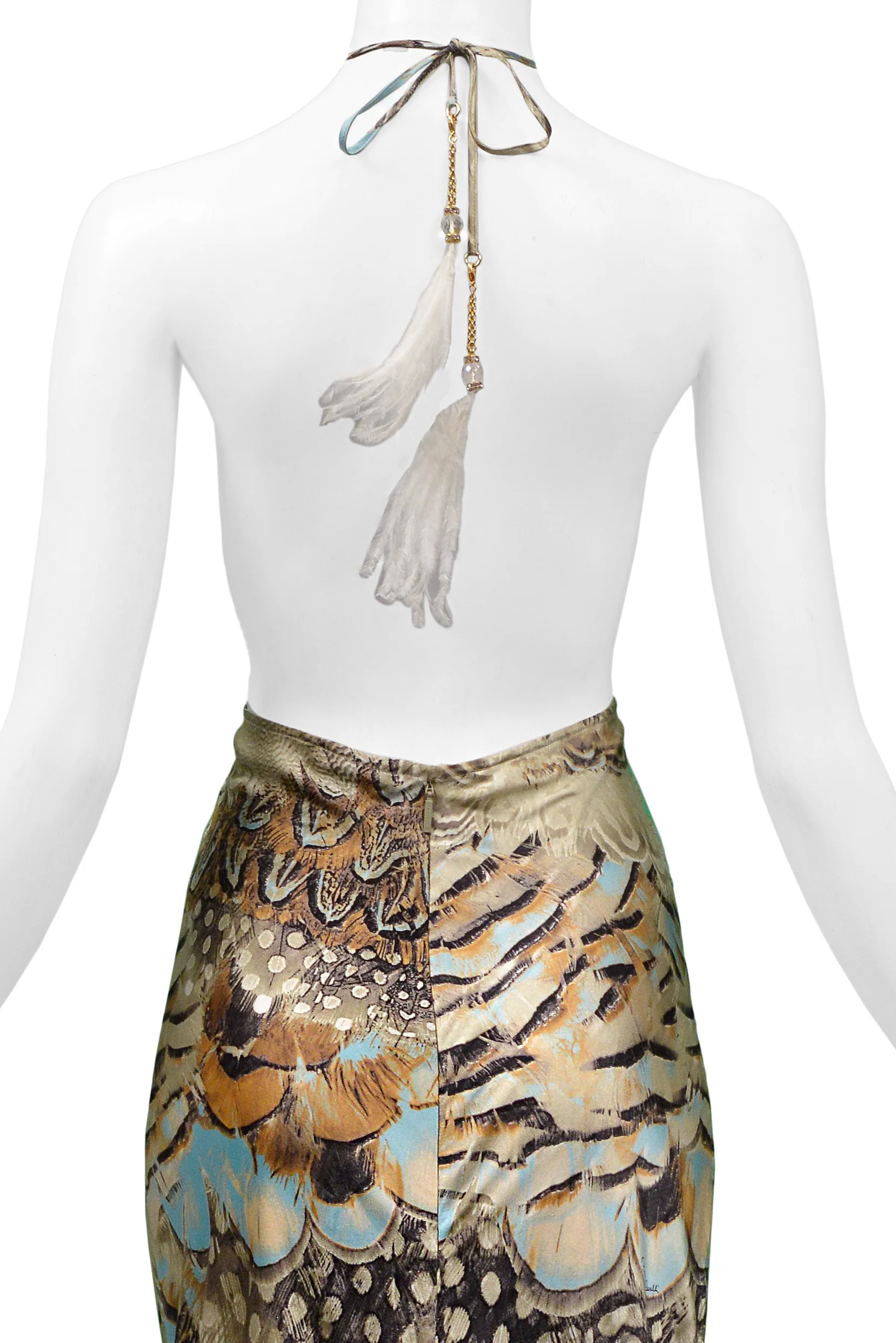 Resurrection Vintage is excited to present a vintage Roberto Cavalli multicolor feather print silk halterneck evening gown featuring bead and feather detailing at neck ties, keyhole accent at chest, dramatic fishtail ruffle hem with cutouts and an open back.Â