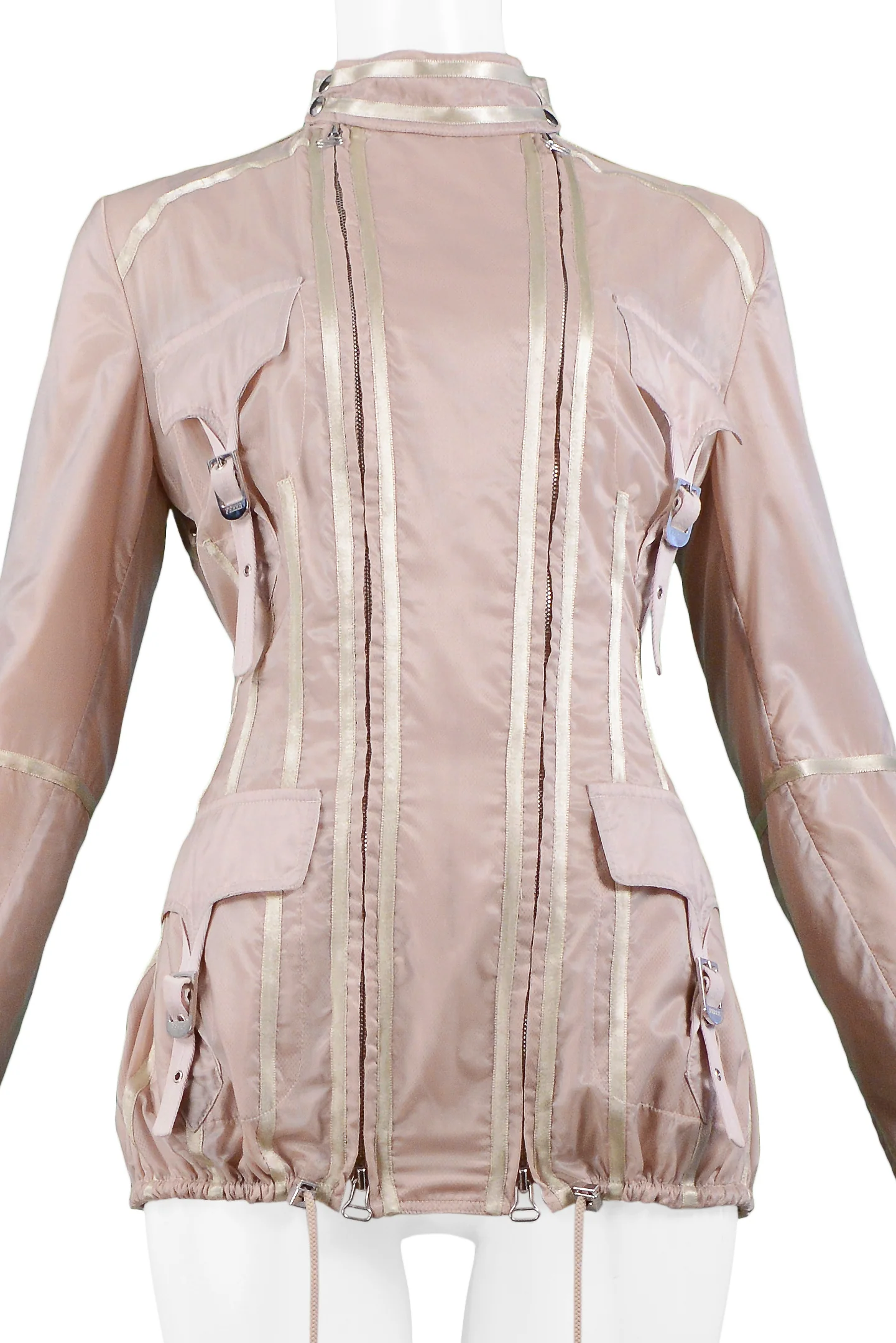 Resurrection Vintage is excited to offer a vintage Gianfranco Ferre blush pink nylon windbreaker jacket featuring double zippers at front, four flap pockets with buckle closures, zippers at sleeves with inset mesh panels, and drawstring at hem.Â