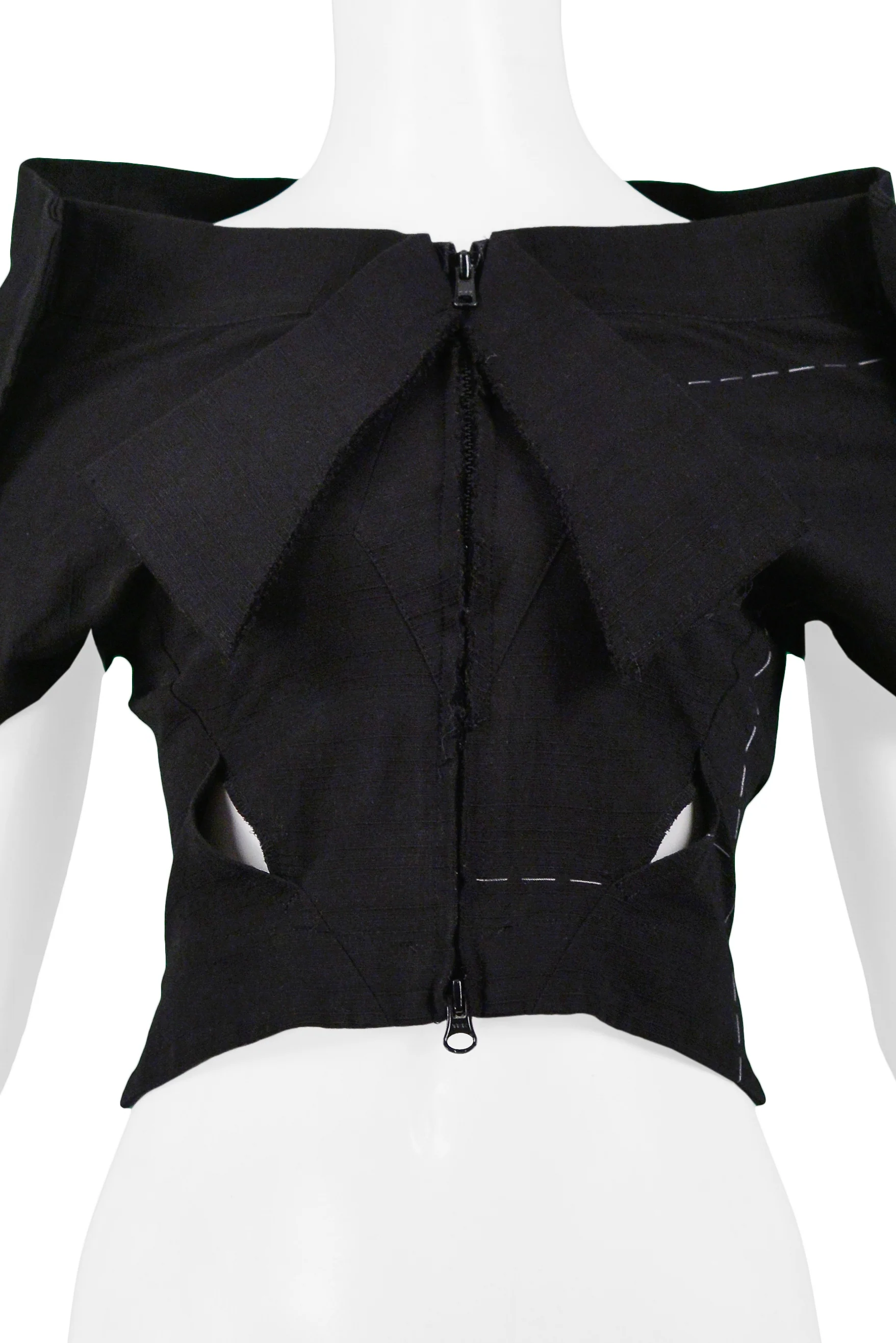 Resurrection is pleased to offer this vintage Yohji Yamamoto black cotton zip-up crop top featuring a wide neckline, short sleeves, raw edges, cut out panels at waist, and white basting stitching.
