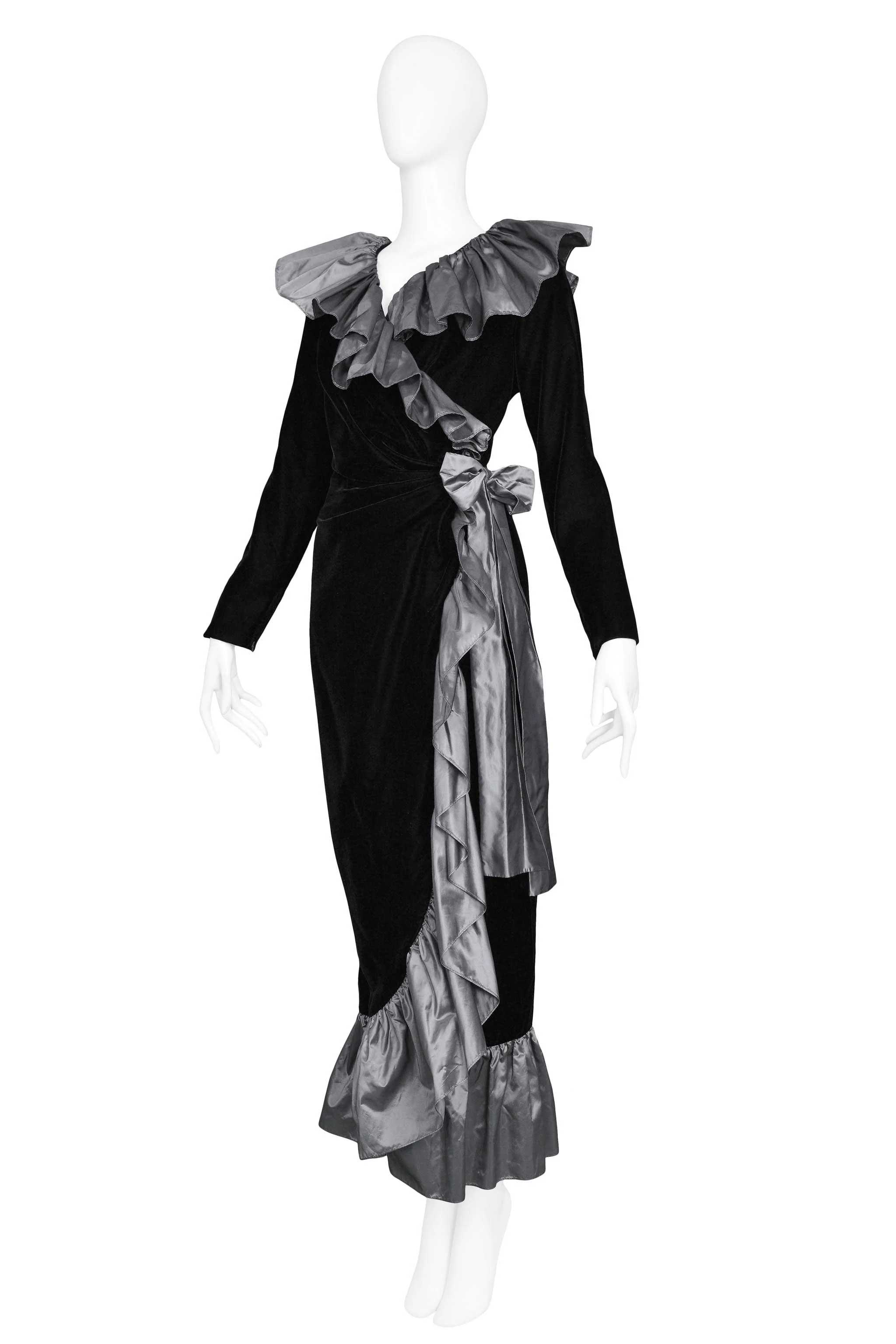 YVES SAINT LAURENT YSL BLACK VELVET & SILVER TAFFETA RUFFLE GOWN